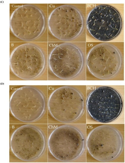 Seed germination is one of the most important stages in plant life. This process is sensitive to the chemical and physical conditions in the rhizosphere []. Generally, heavy metals inhibit seed germination and seedling development by the inhibition of storage food mobilization, a reduction in radical formation, the disruption of cellular osmoregulation and the degradation of proteolytic activities []. For example, an excess of Cu, according to many researchers, leads to a reduction in seed germination [,,,]. In germinating seeds, Cu interferes with the release of nitrogen from the storage tissue, affecting not only the development of the seed embryo, but also the overall activity of proteases []. It induces the mobilization of biomass by the release of glucose and fructose, thus inhibiting the breakdown of starch and sucrose. The toxicity of Cu affects the overall metabolism of the plant, water uptake, the lack of mobilization of material reserves, etc. []. This element moves slowly in the soil, usually as an organic complex, and accumulates in the soil, mainly on its surface [].