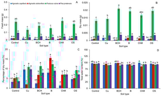 Values of fresh (A) and dry (B) mass, percentage of dry mass (C) and water content (D) in grass seedlings germinated on Petri dishes with various modifications of soil contaminated with copper; Cu—copper soil, copper soil with sorbents: BCH—biochar, B—bentonite, ChM—chicken manure, OS—organo-zeolitic substrate; mean values (n = 5; ± SD) marked with different letters (within each species) differ significantly according to Duncan’s test with p ≤ 0.05.