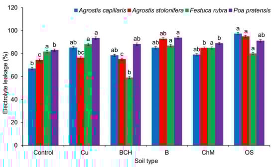 Percentage of electrolyte leakage through cell membranes of grass seedlings germinated on various modifications of soil contaminated with copper; Cu—copper soil, copper soil with sorbents: BCH—biochar, B—bentonite, ChM—chicken manure, OS—organo-zeolitic substrate; mean values (n = 5; ± SD) marked with different letters (within each species) differ significantly according to Duncan’s test with p ≤ 0.05.