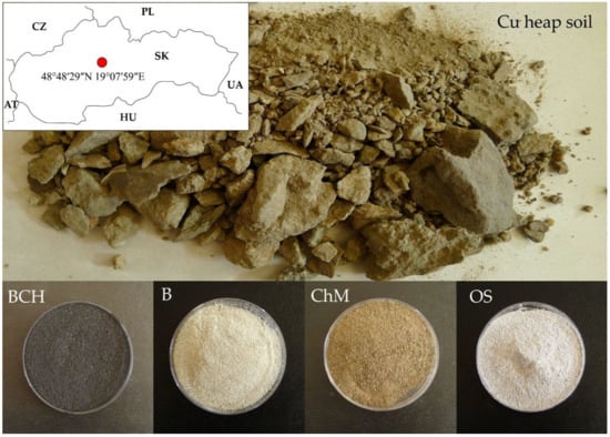 The study material was the copper-polluted soil obtained from the Maximilián heap (48°48′29″N 19°07′59″E), located in the village of Špania Dolina (near Banská Bystrica city, Slovakia) (Figure 6). The average copper content in the soil samples was 1099 mg·kg−1, which is several times higher than the EU limit value according to Council Directive 86/278/EEC (50 to 140 mg·kg−1) []. The characteristics of this area have been described in detail in the paper of Turisová et al. []. In these areas, copper and silver ore mining was carried out over several centuries. The area of Špania Dolina ore field represents one of the historically most distinguished copper mining deposits in Europe. Here, the mineralization forms a 4 km long and 1.5 km wide vein stretching between the hill Panský diel (48°47′53.66″N 19°08′57.95″E) on the south and the village Staré Hory on the north to the east of Starohorský potok []. The first written reports of ore mining in the area of Špania Dolina are from the 11th century (from the year 1006). At first, copper and silver ore was mined in Staré Hory (on historical deposit Haliar). Later, the mining expanded further south from already the extinct village Richtárová and Špania Dolina locality []. After depleting the surface portions, the mining was gradually transferred to underground mining from the mid-14th century. The maximum development of copper ore mining with an extremely valuable silver content was in the years 1496–1546. Since the 17th century, mining gradually declined until it completely disappeared in the early 20th century []. Du-ring the years 1963–1964, old mine heaps (originating from the 16th–19th century) in the area of village Richtárová were re-mined by surface mining, which significantly changed the original configuration [].
