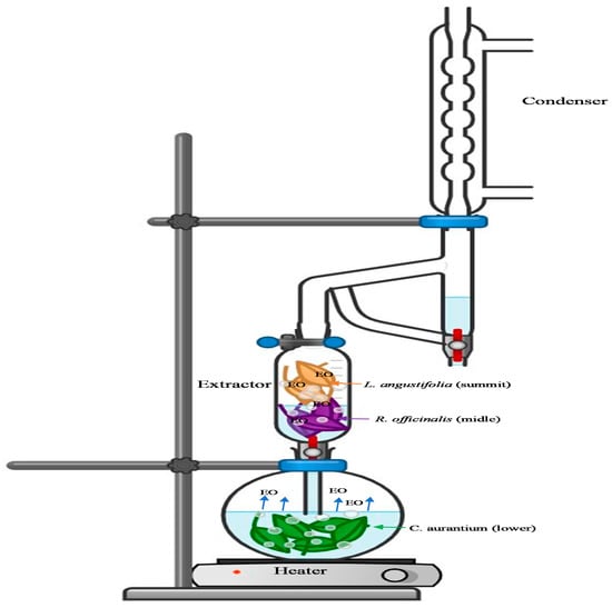 The essential oil extraction was carried out according to the protocol described by El Kharraf et al. [24], using a Clevenger-type and an extractor apparatus. The total weight of plants was 100 g combined in different ratios and distributed (Table 1) in an apparatus as depicted in Figure 1. In the extractor, the two plants were arranged in two layers in a perforated plate, Ro in the middle and La in the summit, whereas in the round bottom flask, the citrus was submerged in water. In addition, 100 g of Ro, La, and Ca were extracted by conventional hydrodistillation using a Clevenger-type apparatus. During the assays, the same order of plants was always maintained inside the apparatus, as shown in Table 1, and only the plants’ ratios were modified, the final weight being fixed at 100 g. The total volume of water was 1000 mL, and the extraction time was 3 h, the moisture content of the dried plant was 17%. The EOs were stored at 4 °C until use in the upcoming experiments.