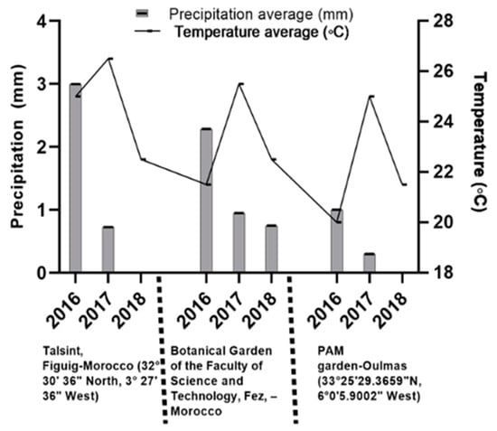 Variation of climatic conditions in the collection regions of Ro, La, and Ca between June 2016 and June 2018. Data are collected from: https://www.meteoblue.com/fr/meteo/historyclimate/weatherarchive/figuig_maroc_6546275 (Accessed date: 15 June 2021).