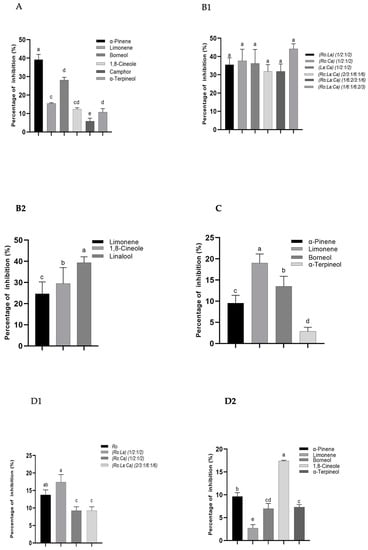Antioxidant activities. (A) Percentage of 2,2-diphenyl-1-picrylhydrazyl (DPPH) free radical-scavenging activity of the major components: α-pinene (215 mg/mL), limonene (4 mg/mL), borneol (4 mg/mL), 1,8-cineole (231 mg/mL), camphor (500 mg/mL), α-terpineol (209 mg/mL), (B1) Percentage of H2O2 inhibition for Ro (45 mg/mL), La (42 mg/mL), Ca (42 mg/mL), (Ro:La) (46 mg/mL), (Ro:Ca) (43 mg/mL), (La:Ca) (46 mg/mL), (Ro:La:Ca) (1:1:1) (42 mg/mL), (Ro:La:Ca) (2/3:1/6:1/6) (43 mg/mL), (Ro:La:Ca) (1/6:2/3:1/6) (42 mg/mL), (Ro:La:Ca) (1/6:1/6:2/3) (42 mg/mL), (B2) Percentage of H2O2 scavenging of the major components (limonene (4 mg/mL), 1,8-cineole (5 mg/mL), linalool (4 mg/mL), (C) Percentage of nitric oxide free radical-scavenging of the major volatiles α-pinene (9 mg/mL), limonene (4 mg/mL), borneol (4 mg/mL), α-terpineol (5 mg/mL), (D1) Percentage of superoxide anion scavenging for Ro (15 mg/mL), (Ro:La) (8 mg/mL), (Ro:Ca) (7 mg/mL), and (Ro:La:Ca) (2/3:1/6:1/6) (15 mg/mL); (D2) Percentage of superoxide anion scavenging of the major components α-pinene (1 mg/mL), limonene (8 mg/mL), borneol (8 mg/mL), 1,8-cienole (8 mg/mL), α-terpineol (8 mg/mL). Bars represent standard deviations (n = 3). Values with the same letter are not significantly different (p > 0.05) by Tukey’s multiple range test.