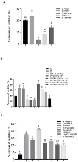 Enzymatic activities. (A) Percentage of lipoxygenase enzyme inhibition of the major components α-pinene (1 mg/mL), borneol (1 mg/mL), 1,8-cienole (1 mg/mL), camphor (1 mg/mL), α-terpineol (1 mg/mL); (B) Percentage of tyrosinase enzyme inhibition obtained from EOs of samples (4.0–4.6 mg/mL) extracted by hydrodistillation and simultaneous hydrodistillation–steam distillation; (C) Percentage of tyrosinase enzyme inhibition of the major components (50 mg/mL). Bars represent standard deviations (n = 3). Values with the same letter are not significantly different (p > 0.05) by Tukey’s multiple range test.