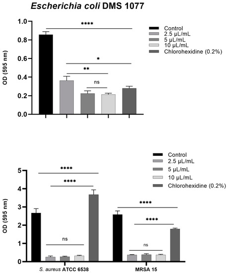 The inhibition of biofilm formation was done using the crystal violet assay [73]. Briefly, 150 µL of an overnight culture prepared as previously mentioned was centrifuged for 10 min at 4 °C. For the preparation of the bacterial suspension, 150 µL of BHI medium supplemented with EOs at the 2.5 µL/mL, 5 µL/mL and 10 µL/mL, chlorhexidine 0.2% (v/v), n-propanol (20%), was added to the centrifuged bacterial culture. Each well containing 180 µL of BHI supplemented with EOs at the appropriate concentration was inoculated with 20 µL of the previous bacterial suspension. The cultures with no EO and in the presence of chlorohexidine (0.2 %, v/v), were used as control. The culture was left to adhere and form a biofilm for 24 h. After this incubation time, non-adherent cells were eliminated and the wells were washed twice with PBS; then, the microplate was left to dry for 15–30 min. Afterwards, crystal violet (4%, w/v) was added, and after 10 min it was removed. Following this, the wells were washed with PBS. To dissolve the crystal violet, 220 µL of ethanol were added to each well. The absorbance was measured at 595 nm after 15–20 min incubation.