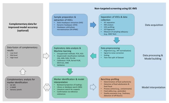 NTS aims to identify the compounds of unknown molecular composition. The workflow for NTS generally consists of sample preparation, instrumental analysis, and post-acquisition data processing [93]. Since little or no a priori knowledge of the chemical structures and behavior of compounds is required, NTS approaches benefit from gentile sample preparation, robust instrumental analysis, and standardized data processing. The workflow for NTS using GC-IMS is shown in Figure 2. The first step, data acquisition, involves sample preparation and subsequent extraction and separation of VOCs. The collected data are then preprocessed and analyzed in the data-processing step. Since no pre-existing knowledge is used, the entire spectral fingerprint obtained by HS-GC-IMS analysis is subject to data analysis and classification or quantification models being built using machine learning tools. In the third step, model interpretation, key compounds are identified, which are extracted through back projection of loadings. Complementary analyses, such as sensory analysis of GC-MS measurements, provide further insight into sample composition and can be used to improve model accuracy. The model coherency is evaluated and finally applied for benchtop profiling.