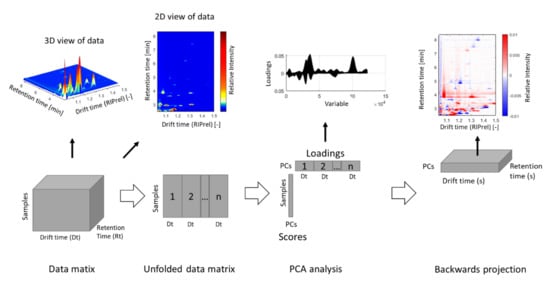Principal component analysis (PCA) is a powerful technique for unsupervised discovery of patterns in data, which is further used for dimension reduction [107]. The information extracted from a data matrix is explained by principal components (PCs), which are orthogonal (mathematically independent) to each other. Since PCA models are predicted without labels or validation by test data, they are generally considered unsupervised. Unsupervised statistical methods are exploratory methods that can be used to study data structures and search for clusters of samples [108]. Hierarchical cluster analysis (HCA) of PCA models in a tree-like diagram (dendrogram) is, e.g., used for the visualization of multivariate association and sample similarities [109]. An extension of PCA for processing three-dimensional (3D) data is provided by multiway principal component analysis (MPCA) [110], which has been applied for the feature extraction of GC-IMS matrices, without prior transformation of the 2D data [99]. Further alternatives to PCA and PLS are models based on PARAFAC [111] or Tucker3 [112], which may also be used with 3D data.