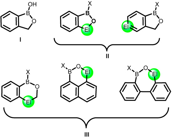 Recently, benzoxaboroles (Scheme 1, structure I) constitute one of the leading groups of organoboron compounds. This is mainly due to their promising biological properties, which have been exploited for the past 20 years in medicinal and bioanalytical chemistry [1,2,3,4]. Benzoxaboroles are strongly predestined for such applications due to their improved thermodynamic stability, resulting from the presence of a strong covalent boron-oxygen bond. Overall, they are rather stable to air and water and, in general, do not undergo rapid degradation under in vivo conditions. Therefore, heteroelement analogues of benzoxaboroles (Scheme 1, general structures II) constitute an interesting alternative and may offer the opportunity for various novel applications while retaining high stability arising from the presence of a strong B-O bond in the ring structure. The replacement of a carbon atom in the boracycle or an adjacent benzene ring with a different atom may result in a significant change of structural behaviour, e.g., a tendency to aggregation involving dative interactions of a heteroatom with the boron atom. Moreover, the presence of a heteroatom may result in modified physicochemical properties, including solubility, lipophilicity, hydrolytic stability, boron Lewis acidity, and others. The aim of this review is to highlight several emerging groups of boracyclic systems which comprise various heteroelement atoms such as another boron, silicon, tin, nitrogen, phosphorus, and iodine. Some ring expanded analogues (Scheme 1, general structures III), including compounds based on naphthalene and biphenyl-scaffold, are also included. Overall, the review is divided into sections based on type of heteroelement and heterocyclic ring as the primary and secondary classification criteria, respectively. The synthesis and physicochemical properties as well as applications of compounds of interest are consecutively presented in each section.