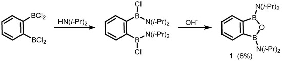 - Kaufmann, D.E.; Boese, R.; Scheer, A. 1,2-Bis(diisopropylamino)-1,2-dihydro-1,2-benzodiboret-ein erstes thermisch stabiles 1,2-Dihydro-1,2-diboret. Chem. Ber. 1994, 127, 2349–2351. [Google Scholar] [CrossRef]