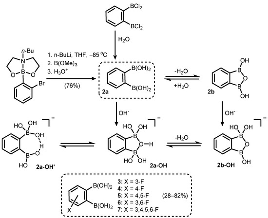 - Durka, K.; Luliński, S.; Serwatowski, J.; Woźniak, K. Influence of Fluorination and Boronic Group Synergy on the Acidity and Structural Behavior of o-Phenylenediboronic Acids. Organometallics 2014, 33, 1608–1616. [Google Scholar] [CrossRef]