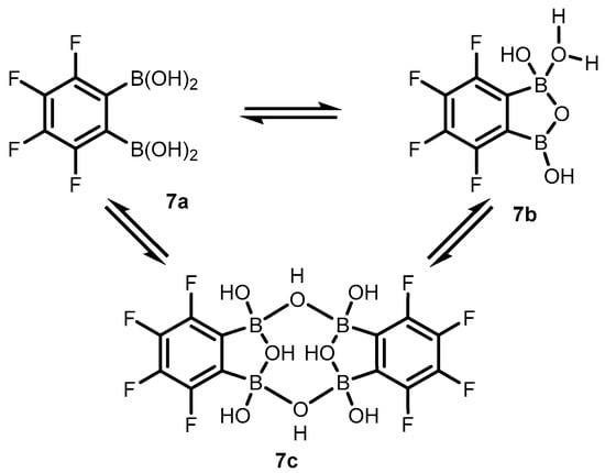 Structural diversity of 3,4,5,6-tetrafluorophenylene-1,2-diboronic acid (7) involving the standard open form (7a), the benzoxadiborole tautomer (7b) and the cyclic dimer (7c).
