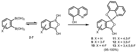 Synthesis of benzoxadiborole 8-oxyquinolinato complexes 8–13.