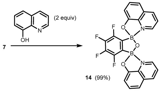 Synthesis of benzoxadiborole bis(8-oxyquinolinato) complex 14.