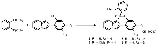 It was found that the benzoxadiborole scaffold is strongly stabilized upon treatment with -8-hydroxyquinoline (Scheme 5) [10]. The reactions of 2a/2b and its fluorinated derivatives 3–7 afforded respective chelate complexes 8–13, both in solution and under mechanochemical conditions. The most Lewis acidic 7 also bound readily two 8-oxyquinolinato ligands, yielding bis(chelate) (14) (Scheme 6) [10]. All of the obtained complexes exhibit green luminescence in acetonitrile solution (λem = ca. 525 nm, Φ = 13–15%), resembling other organoboron 8-oxyquinolinato complexes. Interestingly, it is blue-shifted in solid state (λem = ca. 500 nm), which was ascribed to the effect of H-bonding and other polar interactions of discrete molecules in the crystal lattice. Importantly, the electroluminescence properties of complexes 8 and 14 was proved by testing OLEDs containing those compounds as emitters [10]. Later on, complex 8 became the subject of in-depth structural characterization, which included interesting solvatomorphic behaviour [11] as well as high resolution single-crystal X-ray diffraction electron density studies performed for the first time in the case of a luminescent oxyquinolinato organoboron complex [12]. Furthermore, 2 was also employed for the synthesis of a series of luminescent (O,N)-chelate complexes (15–18) with 2-(imidazo[1,2-a]pyridin-2-yl)phenol ligands (Scheme 7) [13]. The products were also characterized by single crystal X-ray diffraction, which revealed formation of H-bonded dimers in the solid state.