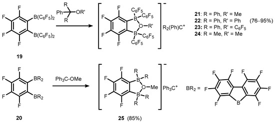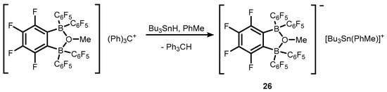 Transformations of strong bidentate Lewis acids of a general formula o-C6F4(BR2)2, R = C6F5 (19), and BR2 = BC12F8 (20) gave rise to various anionic or neutral boracyclic species structurally closely related to 7b/7c (Scheme 8) [14,15,16,17]. However, it should be noted that most of them are formed, at least in a formal sense, by means of dative O→B interactions. Specifically, weakly-coordinating borate anions o-C6F4[B(C6F5)2]2(μ-OR), R = Me, Ph, C6F5, and C6F4[BC12F8]2(μ-OMe) were employed for stabilization of selected tertiary carbocations in respective ion-pair compounds (21–24 and 25, respectively) (Scheme 8) [15,16,17,18]. It was found that trityl salts (21–23) are effective co-catalysts of ethylene polymerization due to activation of dimethyl zirconocene (Cp2ZrMe2), resulting in corresponding products with Cp2ZrMe+ cation [15,18]. Compound 21 was also used for generation of stannylium cationic species 26 (Scheme 9) [19].