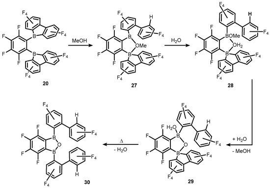 Transformations of 20 to various boracyclic systems (27–30) upon interactions with MeOH and H2O.