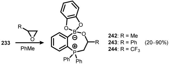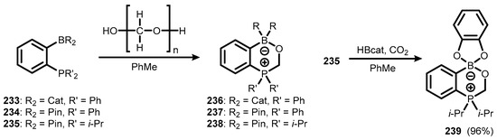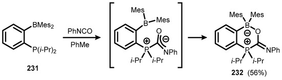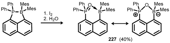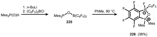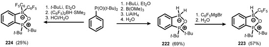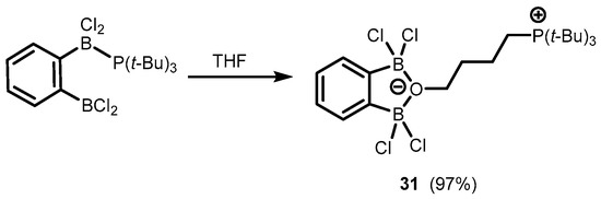 In addition, one can also mention herein the synthesis of a zwitterionic system (31) based on an anionic benzoxadiborole framework with a C4-chain attached to an oxygen atom and decorated with a cationic phosphonium end group. This was obtained by the ring opening of the THF molecule due to interaction with a Frustrated Lewis Pair system composed of 1,2-bis(dichloroboryl)benzene and tris(tert-butyl)phosphine (Scheme 11) [21].