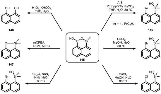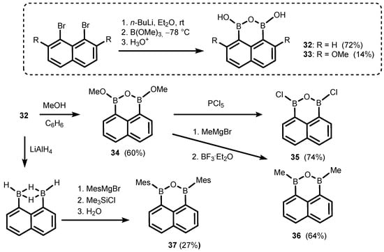 The ring-expanded benzoxadiborole analogues are based on naphthalene and biphenyl scaffolds. Thus, 1,3-dihydroxy-1H,3H-naphth[l,8-cd][l,2,6]oxadiborin (32) (Scheme 12) is easily accessible by diboronation of 1,8-dilithionaphthalene with B(OMe)3 [22,23,24]; 4,9-Dimethoxy derivative (33) was obtained analogously and characterized by single-crystal X-ray diffraction [25]. Compound 32 was successfully used as a coupling partner in selected Suzuki–Miayura cross-coupling reactions, resulting in the formation of new aryl-aryl bonds [26,27,28]. Thus, its behaviour seems to be rather typical of arylboronic acids and their derivatives. However, unlike benzoxadiboroles, the B-O-B linkage in 32 seems to be rather stable as there are no data which might indicate that a reversible hydrolysis to naphthalene-1,8-diboronic acid occurs to any appreciable extent. Compound 32 was used as a starting material for synthesis of a few 1H,3H-naphth[l,8-cd][l,2,6]oxadiborin derivatives (34–37) where hydroxyl groups were replaced with OMe, Cl, Me [23], or mesityl (Mes) substituents [24], respectively.