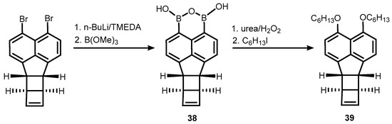 Very recently, a structurally extended analogue of 32 based on bicyclohexene-peri-naphthalene framework 38 was obtained using an analogous protocol involving bromine-lithium exchange in an appropriate dibromide, followed by boronation. It should be stressed that the system features a significant ring strain arising from the presence of two C4 and one C5-ring fused with the naphthalene core. Nevertheless, 38 was used successfully for the synthesis of peri-substituted bis(hexyl ether) (39)via oxidation of B-C bonds followed by alkylation (Scheme 13) [29].