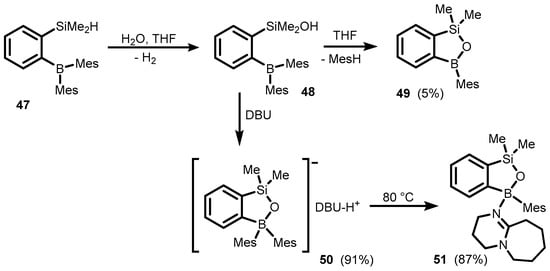 Benzosiloxaboroles are silicon analogues of benzoxaboroles where the carbon atom in a boracyclic ring is replaced by a silicon atom, thus resulting in the formation of a B-O-Si linkage. The first benzosiloxaborole derivative bearing mesityl group at the boron atom (49) was synthesized in 2008 (Scheme 17) [37,38]. The starting 1-dimesitylboryl-2-(dimethylsilyl) benzene (47) was subjected to hydrolysis of the Si-H bond followed by ring closure effected through an attack of silanol on one of the B-Mes bonds, yielding mesitylene as a byproduct. The reaction occurs slowly in THF at rt, but can be accelerated by heating or the addition of tertiary amine such as Et3N and diazabicyclo[5.4.0]undec-7-ene (DBU). In the case of the latter, one can isolate an intermediate ionic compound (50) with the boracyclic anion resulting from the quantitative deprotonation of silanol (48). When heated in THF at 80 °C, it undergoes transformation to complex 51 with the DBU ligand coordinated to the boron atom in 49.