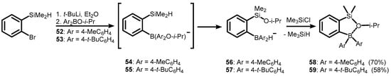 The bromine-lithium exchange reaction of ortho-(dimethylsilyl)bromobenzene with t-BuLi, followed by trapping with (isopropoxy)diarylboranes (52–53), resulted in borohydride intermediates (56–57), which form neutral ortho-(alkoxysilyl)(diarylboryl)benzenes (58–59) after the addition of chlorotrimethylsilane. The formation of 56–57 can be explained in terms of intramolecular hydride–isopropoxide exchange between silicon and boron atoms in initially formed unstable alkoxyborate complexes (54–55) (Scheme 18) [39].