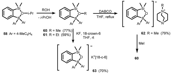 Compound 58 reacts readily with MeOH and EtOH to give methoxysilane 60 and ethoxysilane 61, respectively (Scheme 19) [39]. The 11B and 29Si NMR spectroscopy data of 58–61 point to intramolecular O→B coordination, which results in the existence of cyclic structures. In addition, X-ray diffraction analysis of 60 confirmed the formation of a boracyclic ring involving a rather strong dative Si-O(Me)→B linkage (B-O distance of 1.652(2) Å). Remarkably, this interaction enhances reactivity of the Me-O bond owing to the enhanced electrophilic character of the carbon atom. Thus, the treatment of 60 with 1,4-diazabicyclo[2.2.2]octane (DABCO) afforded ionic complex 62, composed of silyloxyborate anion and DABCO-Me cation (Scheme 19). However, the oxygen atom in the anion is nucleophilic and can be readily methylated to regenerate 60. Finally, the cleavage of the Me-O bond in 60 can also be performed using KF in the presence of 18-crown-6 ligand to give potassium salt (63).