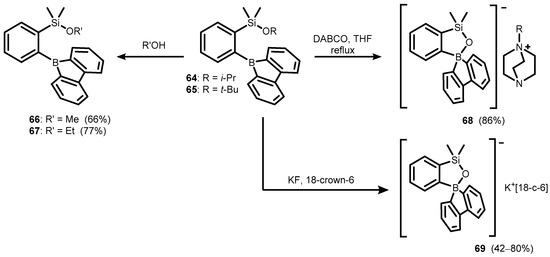 Analogous ortho-(alkoxysilyl)(borafluorenyl)benzenes (64–65) were obtained using the protocol described above for 58–59. Compound 64 was readily converted to respective methoxy- and ethoxysilanes (66–67) and resulted in ionic compounds 68–69 upon treatment with 1,4-diazabicyclo[2.2.2]octane (DABCO) and KF/18-crown-6, respectively (Scheme 20) [40].