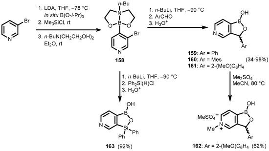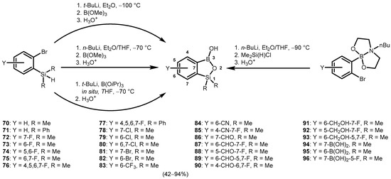 The synthesis of a benzosiloxaboroles bearing hydroxy group at the boron atom, i.e., 3-hydroxybenzosiloxaboroles, was accomplished using two general protocols. The first one involves bromine-lithium exchange in ortho-bromoaryl(dimethyl)silanes and subsequent boronation with trialkyl borates B(OR)3 (R = Me, Et, i-Pr), followed by hydrolysis, leading to intramolecular dehydrogenative condensation (Scheme 21) [41,42,43]. The second method involves the addition of Me2Si(H)Cl to 2-(2-lithiophenyl)-butyl-1,3,6,2-dioxazaborocan or its functionalized analogue, generated via Br-Li exchange using n-BuLi in Et2O/THF (1:1) at low temperatures, typically below −90 °C (Scheme 21) [41,42,43]. Extensive work resulted in the preparation of a number of 3-hydroxybenzosiloxaboroles (70–96) bearing substituents such as F, Cl, Br, CF3, CN, CHO, CH2OH, and B(OH)2, attached at various positions of the aromatic ring [41,42,43].