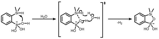 The formation of 3-hydroxybenzosiloxaboroles was the subject of some mechanistic studies aimed mainly at the elucidation of the activation pathways of the Si-H bond in boronated arylsilane precursors. DFT (M06-2X22/6-31+G(d)23) theoretical calculations revealed that the process of ring closing is driven by the coordination of an oxygen atom from the B(OH)2 or, far better, from the anionic B(OH)3− group to the silicon atom (Scheme 22) [44].