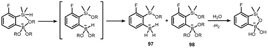On the other hand, experimental studies showed that, in the absence of water, the ortho-(dimethylsilyl)-substituted trialkoxyaryl(boronate) anion undergoes hydride transfer from silicon to boron to give a mixture of tris(hydrido)arylborate and tris(alkoxy)arylborate anions (97–98) as confirmed by 11B NMR spectroscopy data (Scheme 23) [43]. Hydrolysis of the mixture proceeds with hydrogen evolution, and the final intramolecular condensation of transiently generated silanol and boronic groups occurs readily to give the siloxaborole ring. In fact, DFT calculations indicate that this process is thermodynamic and favourable, to a similar extent, as the condensation of carbinol and boronic groups, resulting in the formation of B-O-C linkage in benzoxaboroles [41].