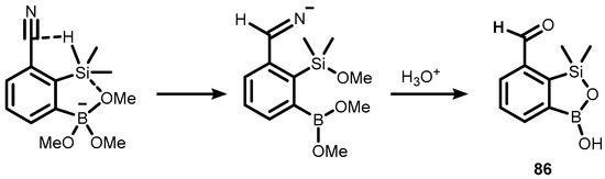 Activation of the Si–H bond by the anionic trialkoxyboronate group, resulting in reduction of the nitrile group and formation of (86).