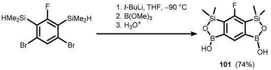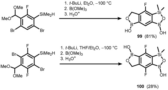 Interestingly, the reduction of otherwise rather inert acetal CH(OMe)2 groups was observed, giving rise to benzosiloxaboroles comprising an additional fused oxaborole ring (99 and 100) (Scheme 25) [42]. An analogous system (101) with two siloxaborole heterocycles fused with the central aromatic ring was also prepared using a double Br-Li exchange in appropriate bis(dimethylsilyl)dibromobenzene, followed by boronation (Scheme 26) [43].