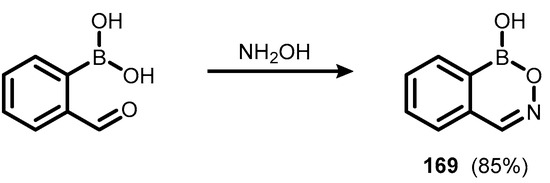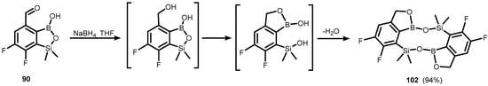 It should be noted that formyl-substituted benzosiloxaboroles (87–89) are cleanly reduced to respective carbinol derivatives (91–93) using NaBH4, whilst an analogous reaction of 90 afforded a unique dimeric species (102) featuring a central 10-membered heterocycle comprising two B-O-Si linkages. Its formation is apparently driven by the preferred formation of an oxaborole ring with concomitant breakdown of the siloxaborole ring with the release of free silanol moiety. Subsequent bimolecular dehydrative condensation leads to the formation of 102 (Scheme 27) [42].
