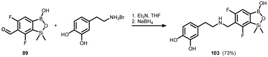 In addition, a formyl derivative (89) was successfully subjected to reductive amination with dopamine, giving rise to the benzosiloxaborole conjugate (103) (Scheme 28) [42].