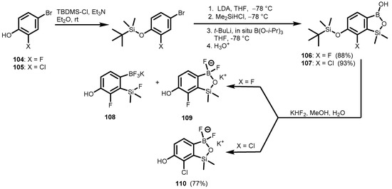 Very recently, the 6-hydroxy-7-chloro substituted 3,3-difluorobenzosiloxaborolate anion was prepared in the form of a potassium salt (110), starting with the protection of 4-bromo-2-chlorophenol (105) with tert-butylsilyldimethyl chloride (TBDMS-Cl), followed by introduction of the Si(H)Me2 group, subsequent boronation, and cleavage of the silyl ether group (OTBDMS) in benzosiloxaborole (107) (Scheme 29) [45]. Similar reactions were performed using 4-bromo-2-fluorophenol (104) as the starting material. Unfortunately, the final cleavage of the OTBDMS group in 106 resulted in a mixture containing a significant amount of aryltrifluoroborate salt (108), together with the desired boracyclic species (109), which hampered further applications.