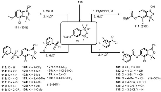 The salt (110) was used as a phenolate O-nucleophile for reactions with MeI, Et2NCOCl, benzoyl, and benzenesulfonyl chlorides as electrophilic partners. The syntheses proceeded smoothly under mild conditions, giving rise to a series of functionalized benzosiloxaboroles (111–137), respectively (Scheme 30) [45].