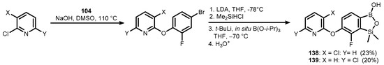 Structurally closely related 6-(chloropyridinyl-2-oxy)-7-fluorobenzosiloxaboroles (138–139) were also obtained using a standard protocol (Scheme 31) [45].
