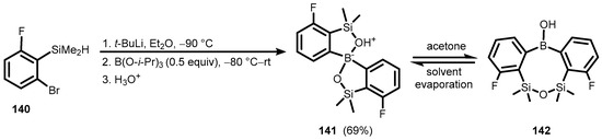 In addition, it is worth noting that Br-Li exchange in arylsilane (140), followed by treatment with B(Oi-Pr)3 (0.5 equiv) gave selectively a unique borinate-type species (141) in ca. 70% yield (Scheme 32) [44]. The X-ray diffraction analysis revealed that its molecular structure features the spiro-arrangement of a central boron atom, linking two benzosiloxaborole systems. In crystal structure, discrete molecules form centrosymmetric dimers due to strong and symmetrical hydrogen bonds (O⋯O distance is only 2.432 Å). VT NMR analyses point to a dynamic character of 141 in CDCl3 solution. Remarkably, acetone-d6 (141) undergoes rearrangement to form 8-membered heterocyclic borinic acid (142) comprising the Si–O–Si linkage. However, the process is reversible because crystallization again afforded 141, whilst prolonged exposure of the solution to air (>1 week) resulted in extensive degradation.