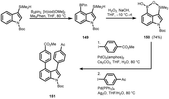 - Sumida, Y.; Harada, R.; Sumida, T.; Hashizume, D.; Hosoya, T. Hydrosilyl Group-Directed Iridium-Catalyzed Peri-Selective C–H Borylation of Ring-Fused (Hetero)Arenes. Chem. Lett. 2018, 47, 1251–1254. [Google Scholar] [CrossRef]