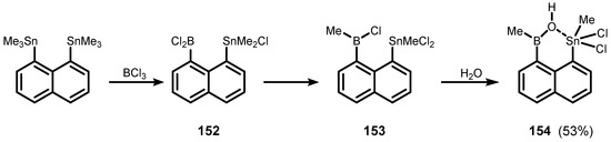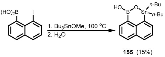 - Breitwieser, K.; Chen, P. Crystal Structure of a 1,1-Dibutyl-1H,3H-naphtho[1,8-Cd][1,2,6]oxastannaborinin-3-ol. Acta Crystallogr. E Cryst. Commun. 2021, 77, 180–183. [Google Scholar] [CrossRef]