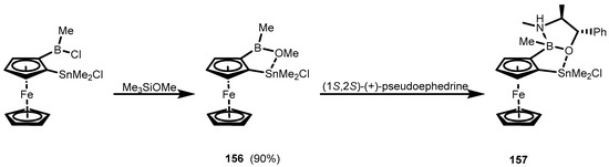 - Boshra, R.; Venkatasubbaiah, K.; Doshi, A.; Jäkle, F. Resolution of Planar-Chiral Ferrocenylborane Lewis Acids: The Impact of Steric Effects on the Stereoselective Binding of Ephedrine Derivatives. Organometallics 2009, 28, 4141–4149. [Google Scholar] [CrossRef]