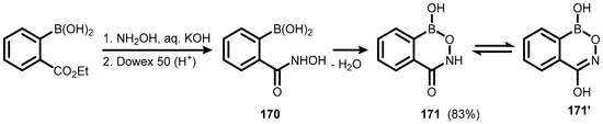 - Dunn, H.E.; Catlin, J.C.; Snyder, H.R. Arylboronic Acids. Imino Derivatives from o-Formylbenzeneboronic Acid. J. Org. Chem. 1968, 33, 4483–4486. [Google Scholar] [CrossRef]