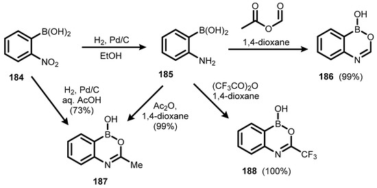 - Sarina, E.A.; Olmstead, M.M.; Nguyen, D.N.; Groziak, M.P. 1-Hydroxy-1H-benzo[d][1,2,6]oxazaborinin-4(3H)-one. Acta Crystallogr C Cryst. Struct. Commun. 2013, 69, 183–185. [Google Scholar] [CrossRef]