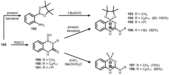 - Zhuo, J.-C.; Soloway, A.H.; Beeson, J.C.; Ji, W.; Barnum, B.A.; Rong, F.-G.; Tjarks, W.; Jordan, G.T.; Liu, J.; Shore, S.G. Boron-Containing Heterocycles: Syntheses, Structures, and Properties of Benzoborauracils and a Benzoborauracil Nucleoside. J. Org. Chem. 1999, 64, 9566–9574. [Google Scholar] [CrossRef]