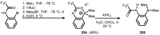 - Shimizu, T.; Kawachi, A. Synthesis, Reactions, and Photophysical Properties of o-(Alkoxysilyl)(borafluorenyl)benzenes. J. Organomet. Chem. 2020, 912, 121179. [Google Scholar] [CrossRef]