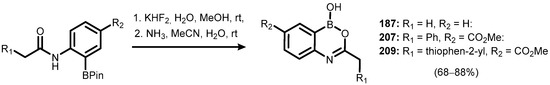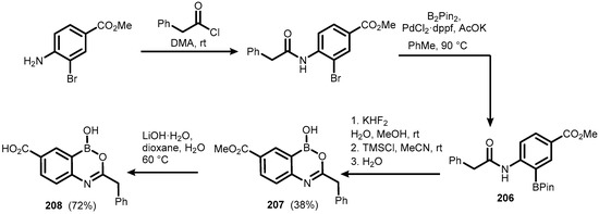 - Yang, F.; Zhu, M.; Zhang, J.; Zhou, H. Synthesis of Biologically Active Boron-Containing Compounds. Med. Chem. Commun. 2018, 9, 201–211. [Google Scholar] [CrossRef] [PubMed]