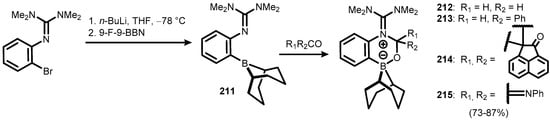 - Kawachi, A.; Zaima, M.; Tani, A.; Yamamoto, Y. Dehydrogenative Condensation of (o-Borylphenyl)Hydrosilane with Alcohols and Amines. Chem. Lett. 2007, 36, 362–363. [Google Scholar] [CrossRef]
