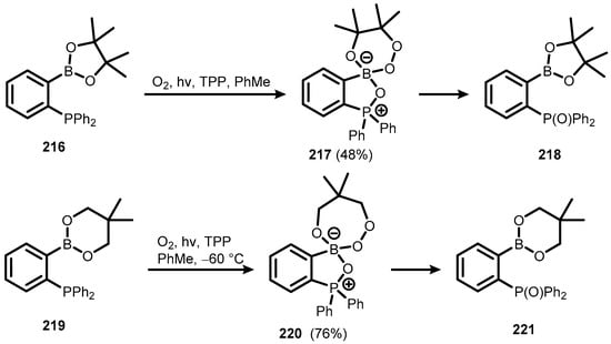 - Porcel, S.; Bouhadir, G.; Saffon, N.; Maron, L.; Bourissou, D. Reaction of Singlet Dioxygen with Phosphine-Borane Derivatives: From Transient Phosphine Peroxides to Crystalline Peroxoboronates. Angew. Chem. Int. Ed. 2010, 49, 6186–6189. [Google Scholar] [CrossRef] [PubMed]