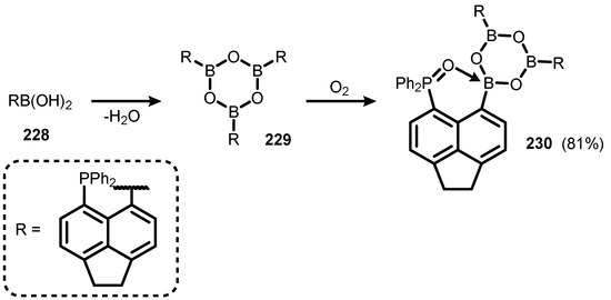 - Furan, S.; Hupf, E.; Lork, E.; Beckmann, J. Synthesis and Structure of 5-Diphenylphosphino- Acenaphth-6-yl Boronic Acid, Related Dialkyl Esters and Boroxine Rings. Z. Anorg. Allg. Chem. 2021, 647, 507–512. [Google Scholar] [CrossRef]