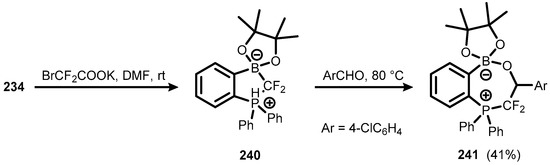 - Smirnov, V.O.; Volodin, A.D.; Korlyukov, A.A.; Dilman, A.D. Trapping of Difluorocarbene by Frustrated Lewis Pairs. Angew. Chem. Int. Ed. 2020, 59, 12428–12431. [Google Scholar] [CrossRef] [PubMed]